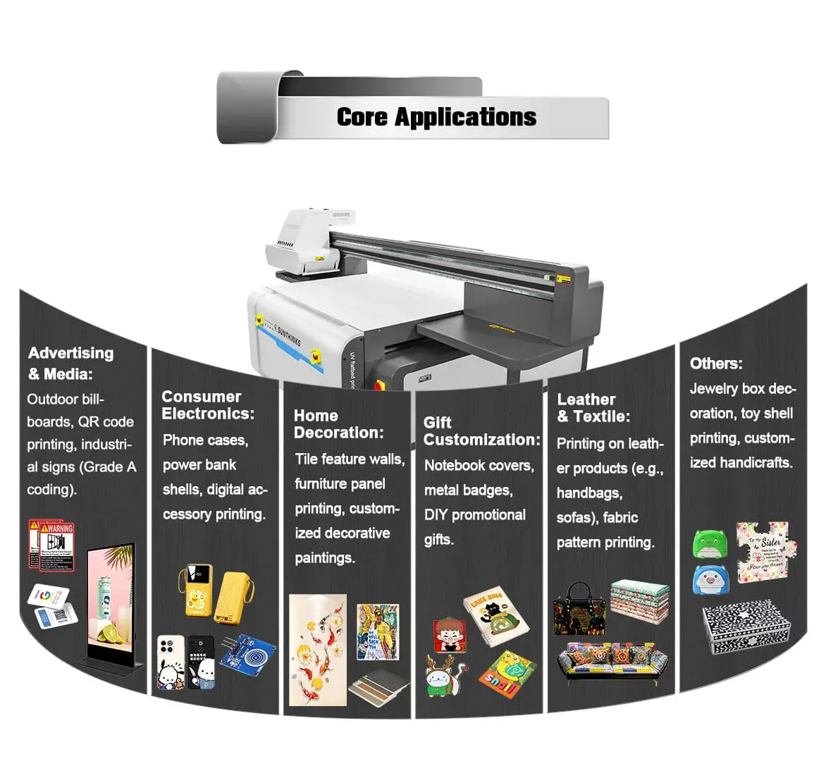 Suitable for rigid/flexible/curved/special-shaped media ,Such as ceramics, metal, leather, acrylic, wood, stone, plastic, etc.