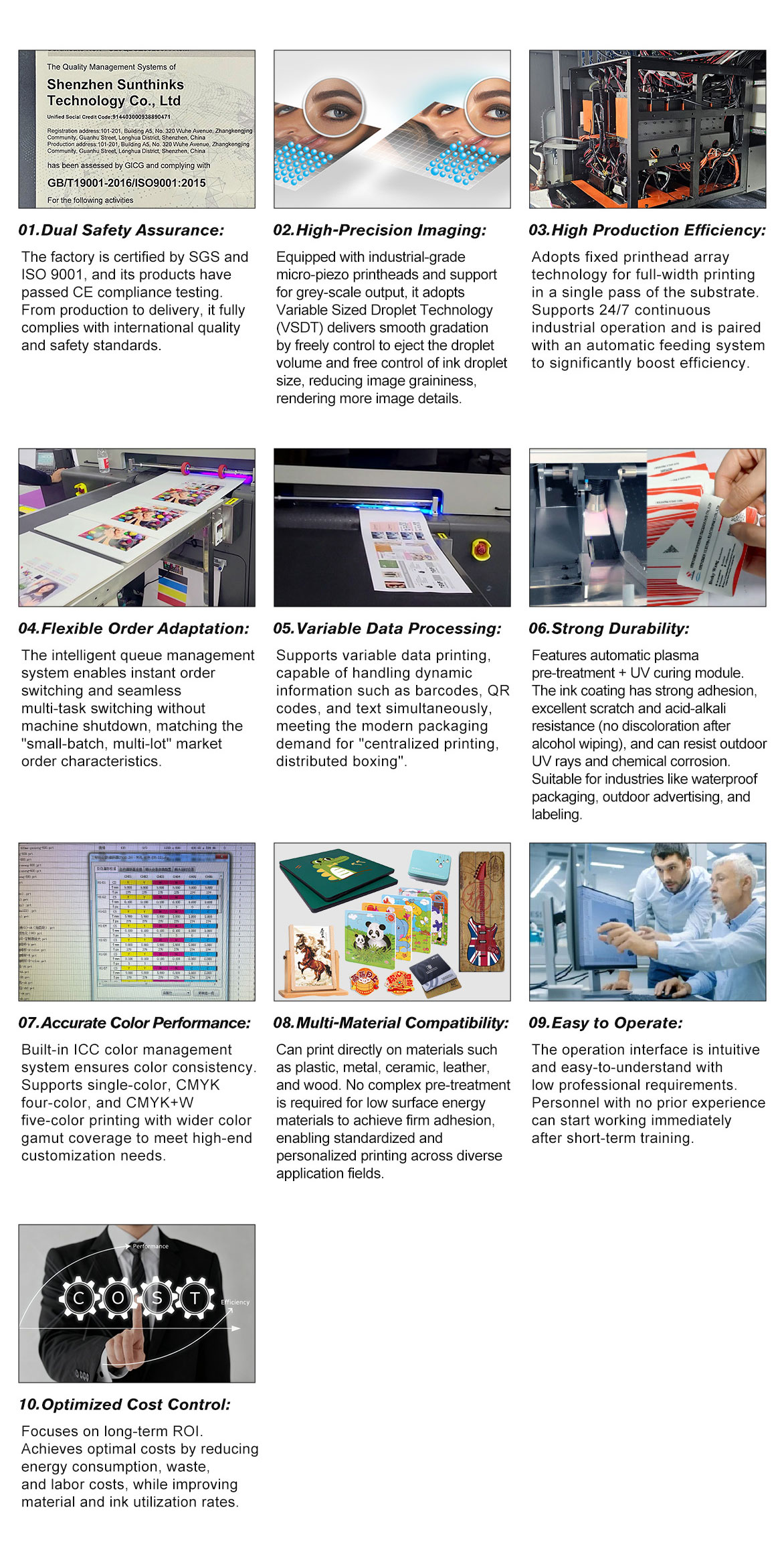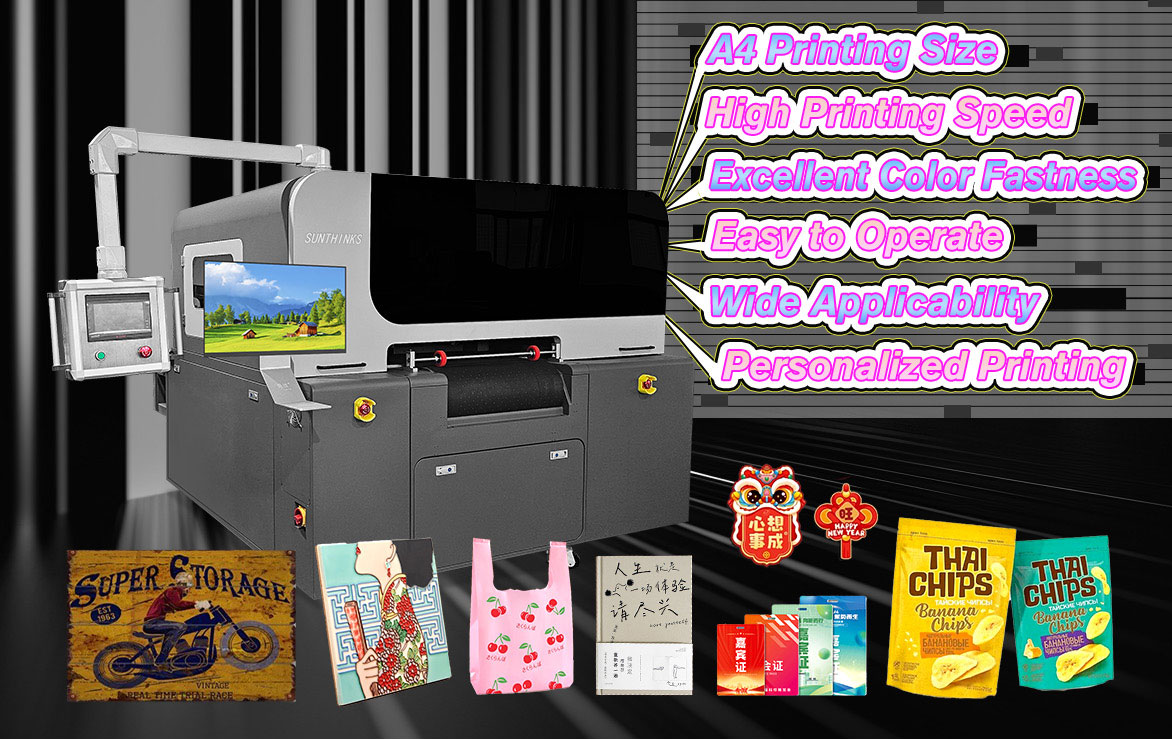 The Sunthinks SU230 UV single pass printer is an A4 sized, high-speed, digital single pass UV printing machine that supports monochrome, four-color CMYK, or five-color CMYK+W printing. It is suitable for batch printing and personalized customization in industries such as high-end gift packaging, plastic packaging, plastic corrugated paper, coated paper, indoor and outdoor billboards, wooden panels, folders, notebook covers, metal packaging, leather, and various corporate/event promotional gifts.